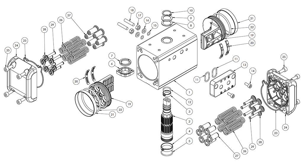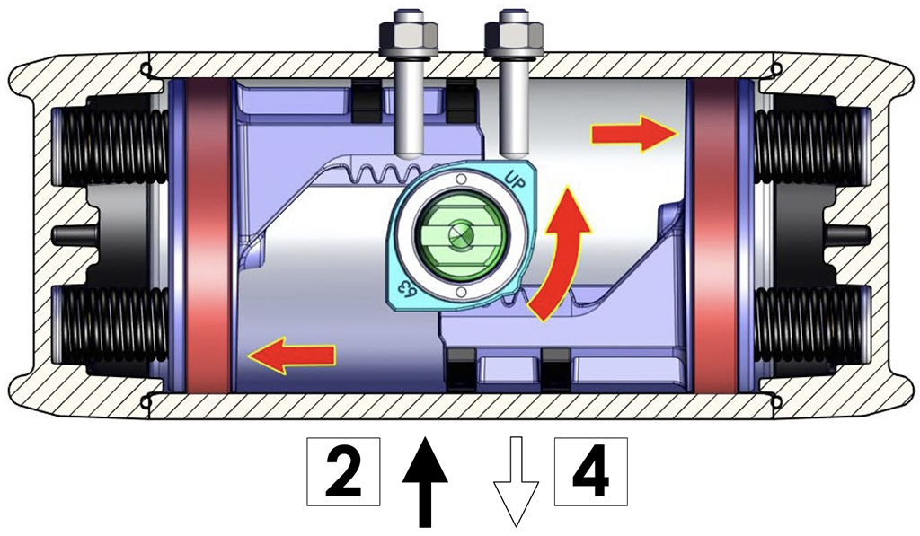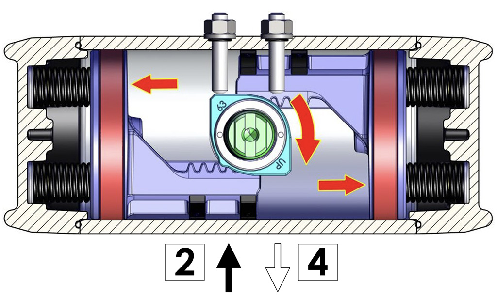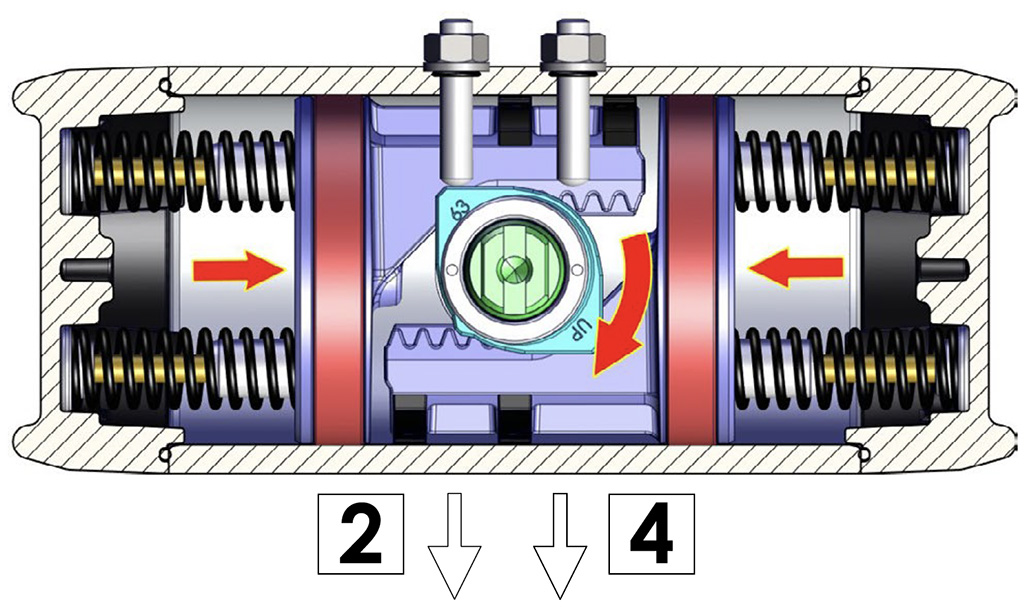 Immettendo aria nel foro 2 di alimentazione, i pistoni si muovono verso l’esterno comprimendo le molle, si ha una rotazione antioraria dell’albero e la posizione finale è quella rappresentata nel disegno.